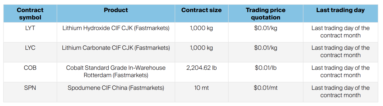 ICE’s battery materials futures expand access to critical risk management tools for the energy transition. These cash-settled contracts, based on benchmarks from Fastmarkets and Benchmark Mineral Intelligence (BMI), offer transparency and price protection across key minerals like lithium, cobalt and spodumene. They complement ICE’s broader offering in environmental products and Alternative fuels.